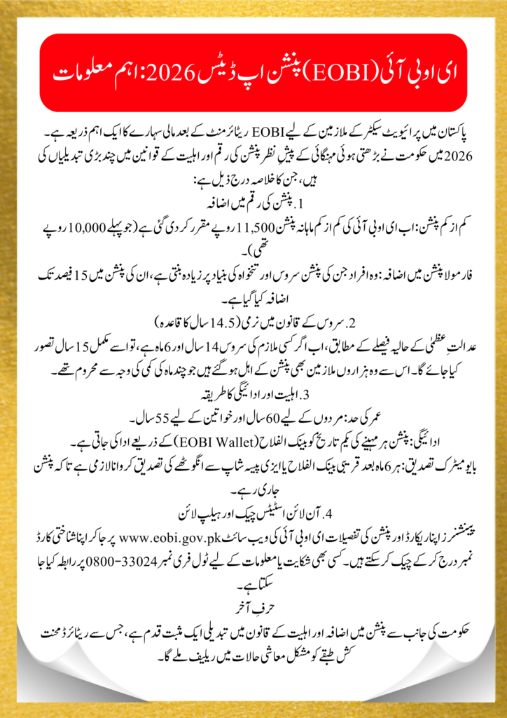 The EOBI Pension Latest News 2026 Increase is a positive step for retired private-sector workers in Pakistan. The minimum pension of Rs. 11,500 and the new 14.5-year eligibility rule provide relief to thousands of families.