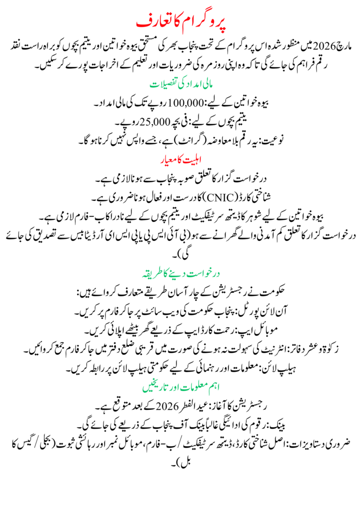 | CM Punjab Rehmat Card | Expected after Eid-ul-Fitr 2026 | Not officially announced yet | Bank of Punjab (expected) | Up to Rs. 100,000 | Non-returnable (Grant) | All cities of Punjab | Punjab | Widows: Rs. 100,000, Orphans: Rs. 25,000 each | Online & Offline |