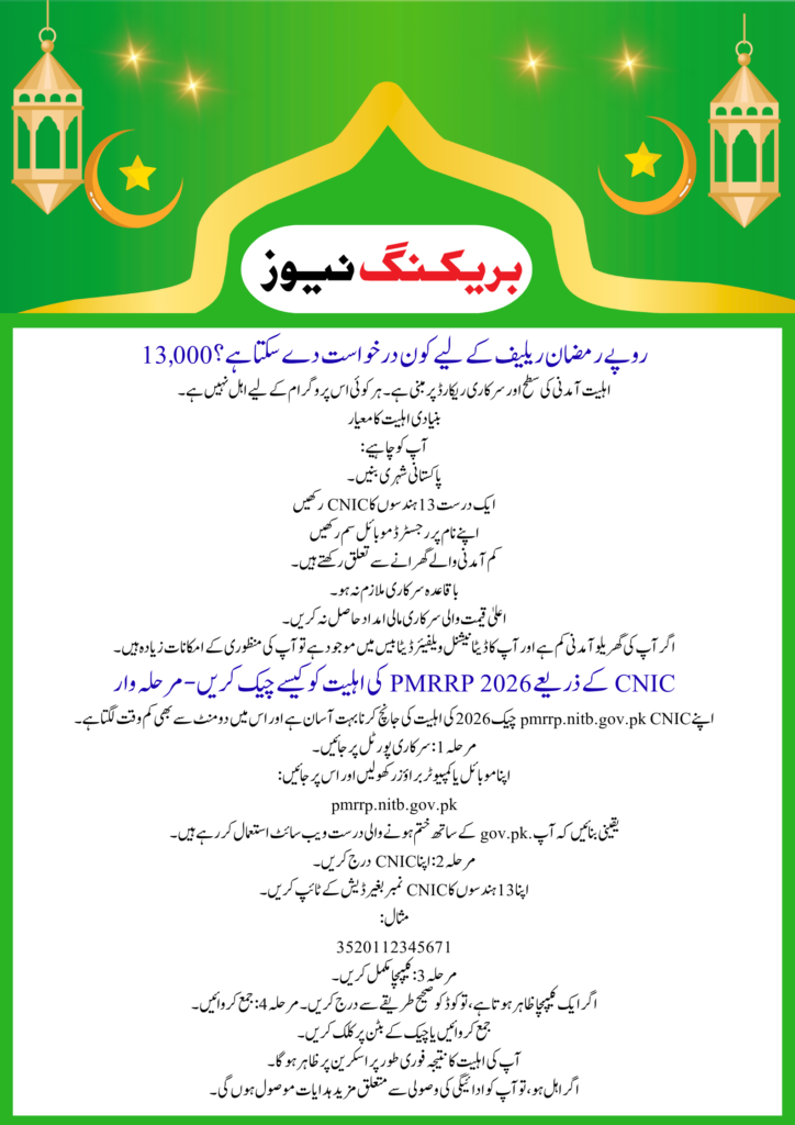 The Government of Pakistan has introduced the PM Ramzan Relief Package 2026 to support low-income families during the holy month of Ramadan. Through the official portal pmrrp.nitb.gov.pk, citizens can check their CNIC online and verify whether they qualify for the Rs 13,000 cash assistance. This digital system is designed to be fast, transparent, and corruption-free so that deserving families can receive financial help without any middlemen.
