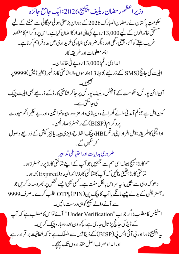 As Ramadan 2026 approaches, many families across Pakistan are looking for financial support to manage rising household expenses. Due to inflation and increasing food prices, the Government of Pakistan has introduced the Prime Minister Ramzan Package 2026 to provide relief to deserving families. Under this program, eligible households can receive Rs 13,000 cash assistance to help cover essential Ramadan expenses like flour, sugar, oil, rice, and other basic groceries.