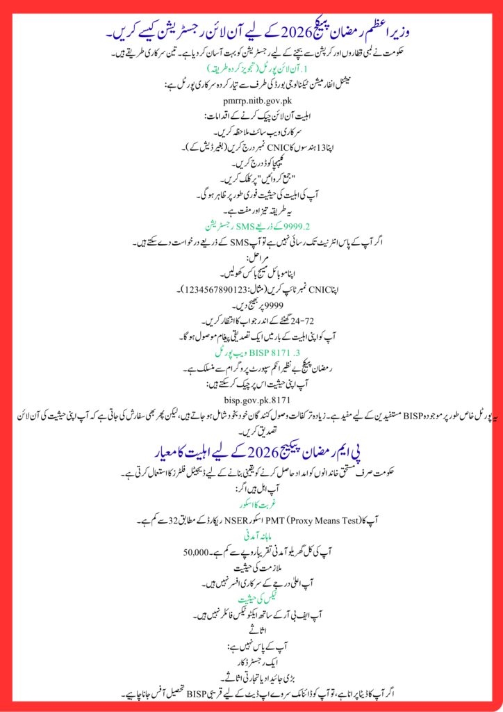 For residents of Punjab, there is also an additional provincial package under the CM Punjab Ramzan Nigehban Package 2026, which offers Rs. 10,000. Eligible families in Punjab may receive up to Rs. 23,000 total relief if they qualify for both programs.