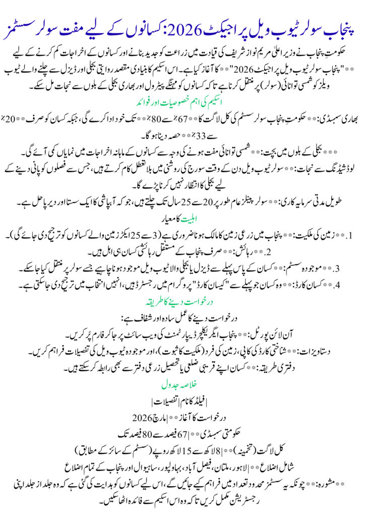 The Punjab Solar Tubewell Project 2026 is a major agricultural initiative launched by the Government of Punjab under the leadership of Chief Minister Maryam Nawaz Sharif. This project aims to help farmers reduce the heavy burden of electricity bills and diesel costs by converting traditional tubewells to solar-powered systems. Due to increasing energy prices in Pakistan, many farmers struggle to irrigate their land properly. Through this program, the government is providing large subsidies so farmers can install solar systems and run their irrigation pumps using free solar energy. This initiative not only reduces farming expenses but also promotes clean energy and sustainable agriculture across Punjab.