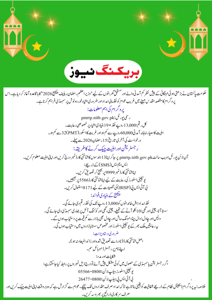 The Ramzan Package pmrrp.nitb.gov.pk 2026 is a major relief initiative by the Government of Pakistan to support deserving families during the holy month. With cash assistance and essential item subsidies, it helps reduce the financial burden caused by inflation.